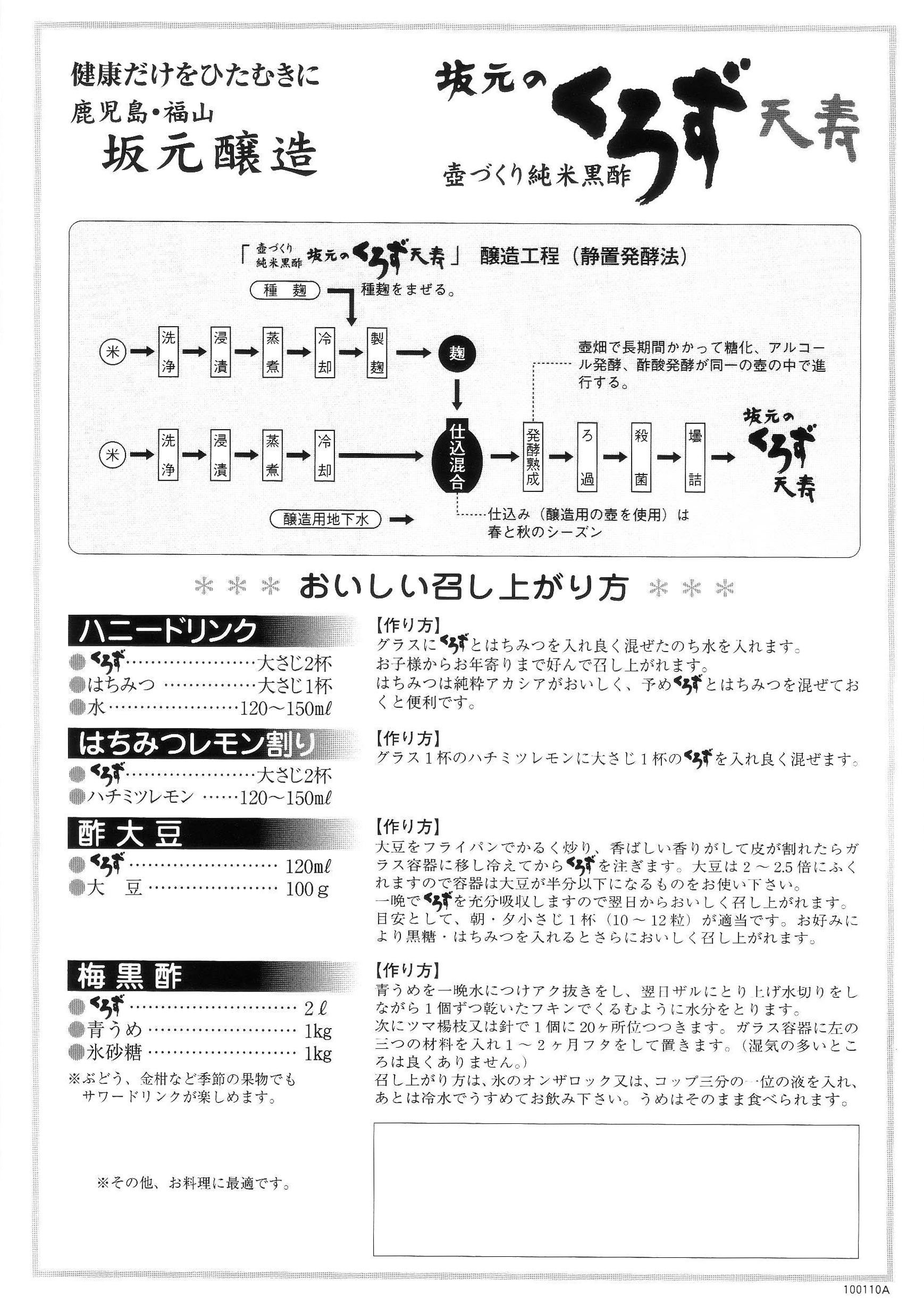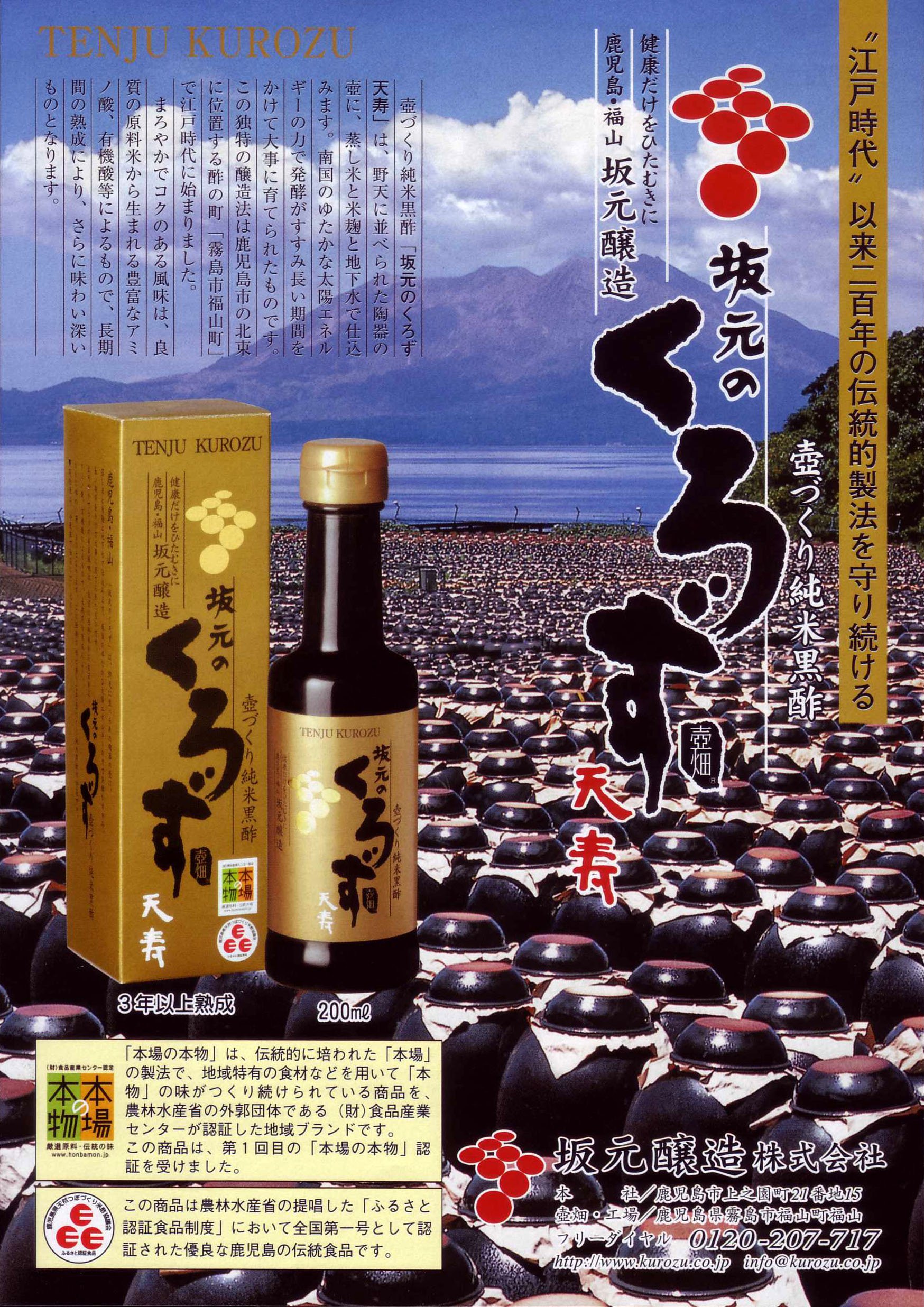 Characteristics of Kurozu of Sakamoto: "Sakamoto no Kurozu" produced in Kagoshima-shi, Fukuyama-cho, Kagoshima Prefecture, will be filled with steamed rice, rice koji and groundwater in pot-pots juxtaposed in the vineyard of the field.