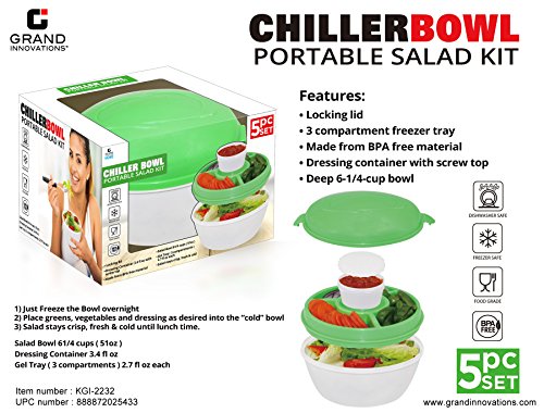 Studio : Grand Innovations Publisher : Grand Innovations Binding : Kitchen Product Description The salad kit that allows you to take your favorite salad "on the go" keeping dressing and greens "cold fresh". Includes an innovative (non toxic) freezer-Gel filled tray that ensures your salad stays cold fresh. Just freeze the bowl overnight. 2. Place greens, vegetables and dressing as desired into the "cold bowl. 3. Salad stays crisp, fresh cold until lunch time. 0