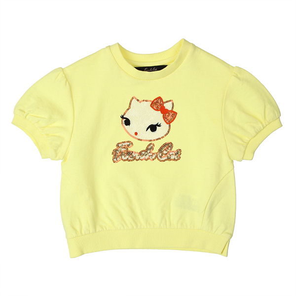 ■상세설명: ; ;얇은 쭈리 다이마루로 만들어진 엘로우 컬러의 맨투맨 티셔츠입니다. 쎄미 가오리핏으로 입었을때 캐주얼한 느낌을 줍니다. 블링블하고 귀여운 고양이 포인트가 있어서 귀여운 느낌을 더해줍니다. 치랭스, 레깅스, 우븐 바지와 코디하시기 좋습니다