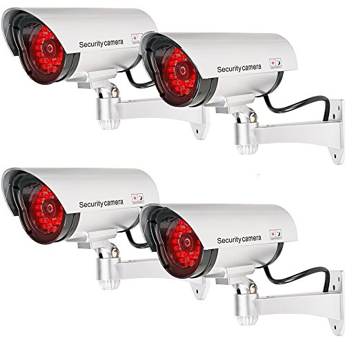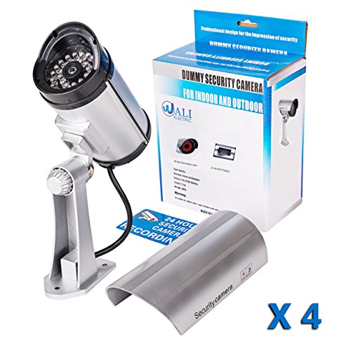 WALI Bullet Dummy Fake Surveillance Security CCTV Dome Camera Indoor Outdoor with 30 Illuminating LED Light + Warning Security Alert Sticker Decals WL-S30-4(Silver), 4 Pack