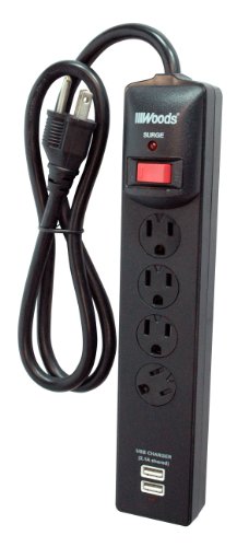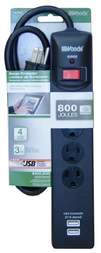 Woods 041302 Dual USB Charger 4-Outlet Surge Protector Powerstrip, 800-Joules of Protection, 3-Foot Cord