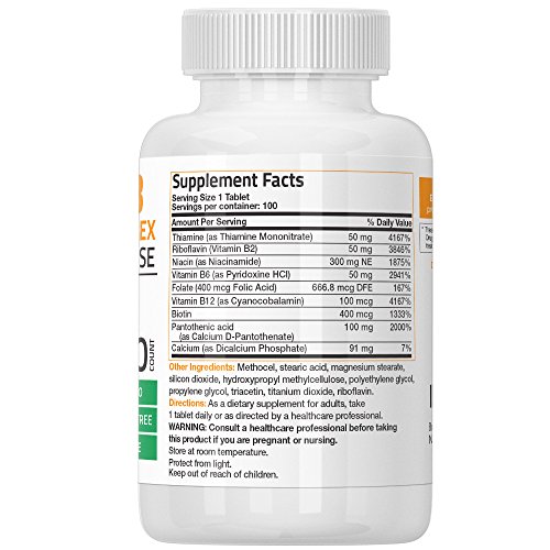 Super B Complex Vitamin Sustained Release This Super B Complex vitamin is offered in a sustained release formula and contains a range of B vitamins, such as B1, B2, B3, B6, Folic Acid, B12, Biotin, Pantothanic Acid and more, which is ideal because B vitamins work best when taken together. The body cannot store B vitamins, so be sure you're getting adequate amounts daily with this pure and powerful B Complex vitamin formula. Vitamin B's claim to fame is real, lasting natural energy, but it provides so much more! B vitamins play an important role in every single chemical process in the body. In addition to this Super B Complex vitamin, Bronson offers a range of B vitamin products for all of your natural health needs, including non-sustained release formulas. This powerful B Complex vitamin of 100 tablets can be conveniently shipped to your door. Order today!*Feature
