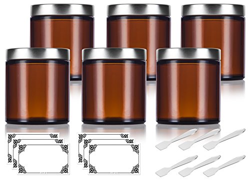 - Includes 6 - 4 oz / 120 ml Amber Glass Straight Sided Jars with Metal Foam Lined Lids + Spatulas and Labels