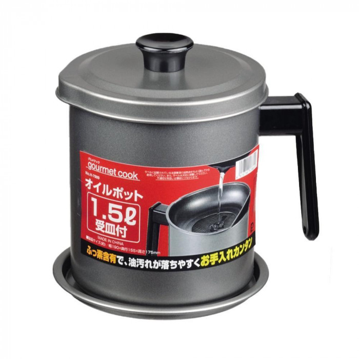 | 素材・材質 | 本体・蓋・受皿・こし網ワク部:鉄(ふっ素含有シリコーン樹脂塗装) こし網:ステンレス鋼 取っ手・蓋つまみ:フェノール樹脂(耐熱温度150度) |