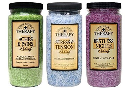 -. Title : Village Naturals Therapy Mineral Bath Soak Variety Set 3 Pack - Restless Nights, Aches & Pain, Stress & Tension (20oz Jars)