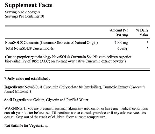 -. Feature : All Natural Anti-Inflammatory - Curcumin, a natural phenol of Turmeric, is well known for its potent antioxidant and anti-inflammatory properties and can play a vital role in the prevention of chronic inflammation which is linked to several conditions regarding joint health, brain health, gut and cardiovascular health. / Patented Technology - The NovaSOL technology in Curcumin+ offers unique properties which result in a fast absorption and very high bioavailability. The unique micelle structure is completely stable at gastric pH allowing for rapid absorption, making it very effective at much lower doses. / Supported by Clinical Data - A human clinical trial showed that NovaSOL Curcumin is on average 185x more bioavailable than a standard extract and Curcumin levels remain in the plasma for up to 24 hours. / Maximum Potency - NovaSOL Curcumin remain in the blood plasma for up to 24 hours