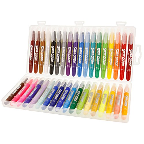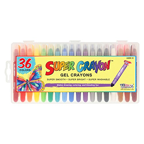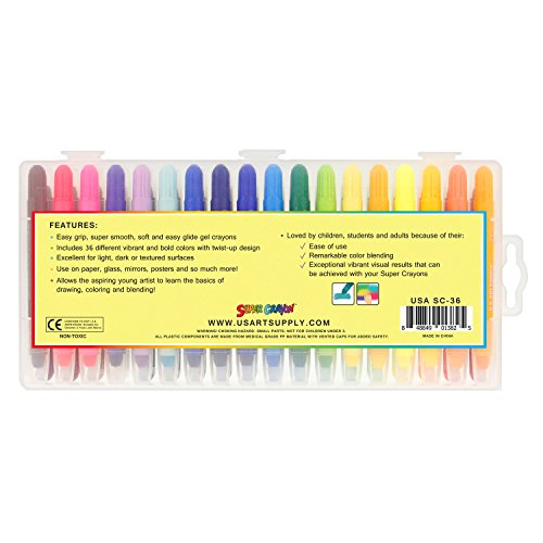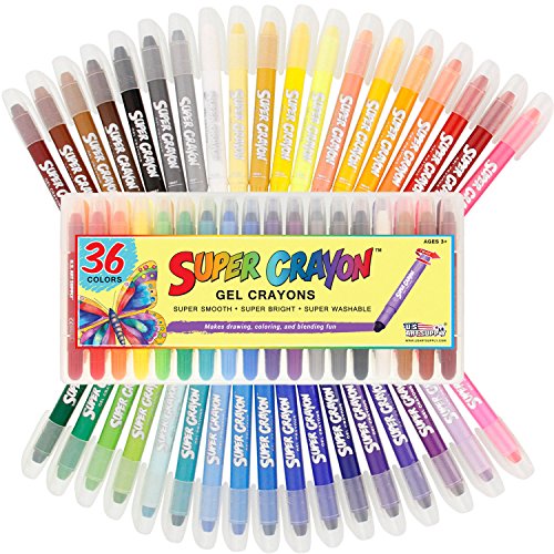 - 36 SUPER SMOOTH GEL CRAYONS: A rainbow of 36 eye-catching super bright, super smooth and super washable colors. Super Crayons are easy to use, easy to grip and apply color with a super smooth easy glide across the page. Twist up color delivery