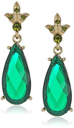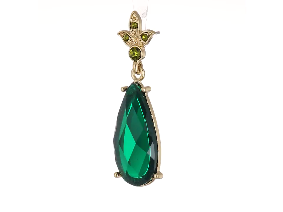 Gold-tone drop earrings featuring pear-shape green faceted stones with green crystal accents