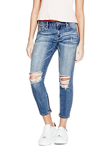 -. Binding : Apparel -. Brand : G by GUESS -. Department : womens -. Feature : Medium rise, sits at hips. Skinny fit and leg. / Medium Destroyed Wash: Medium indigo shade with hand sanding, destroyed details and whiskering. Due to the nature of the fabric and wash, each garment has its own unique appearance. / Five-pocket construction. Zip fly. / 8.25" front rise. 13.25" back rise. / 11" leg opening. 25" inseam. Measurement taken from a size 27. -. Label : GByGUESS -. Manufacturer : GByGUESS -. Model : R71A2800000 -. MPN : R71A2800000 -. NumberOfItems : 1 -. PartNumber : R71A2800000 -. ProductGroup : Apparel -. ProductTypeName : PANTS -. Publisher : GByGUESS -. Studio : GByGUESS -. Title : G by GUESS Women's Monika Cropped Skinny Jeans