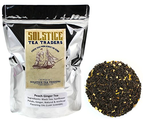 -. Binding : Misc. -. Brand : Solstice Tea Traders -. EAN : 0651174997513 -. Feature : FULL LEAF BLACK TEA INFUSED WITH GINGER AND PEACH- Among our most popular blends, a truly unique and flavorful black peach tea with ginger / GINGER PEACH BLACK TEA- A medium body black tea, with a sweet peach flavor, and a very slight bite of real ginger / GREAT HOT PEACH GINGER BLACK TEA, ALSO GREAT AS GINGER PEACH ICED TEA- This incredible blend performs great as iced or hot tea, the fruit notes pair well with the slightly spicy ginger to create an exquisite drink anytime of year / EACH BATCH IS SMALL BATCH HAND BLENDED TO ENSURE QUALITY- Our ginger peach black tea is small batch hand blended to ensure regularity and quality between batches -. IsAdultProduct : 0 -. Label : Solstice Tea Traders -. Manufacturer : Solstice Tea Traders -. PackageQuantity : 1 -. ProductGroup : Grocery -. ProductTypeName : GROCERY -. Publisher : Solstice Tea Traders -. Size : 16 Ounces -. Studio : Solstice Tea Traders -. Title : Peach Ginger Black Tea, Loose Leaf Ginger Peach Black Loose Tea- (One Pound, 175+ Servings) -. UPC : 651174997513