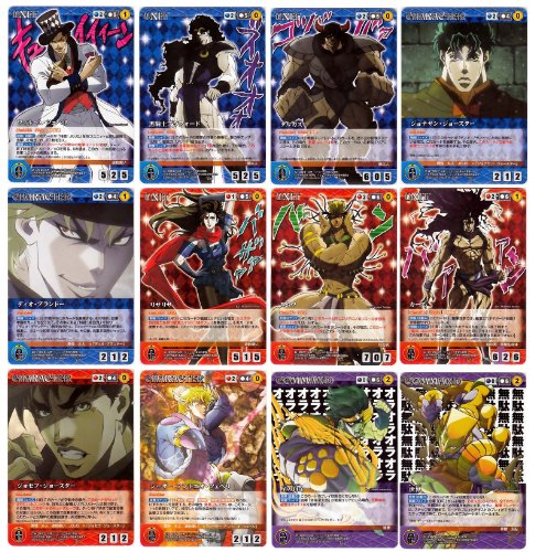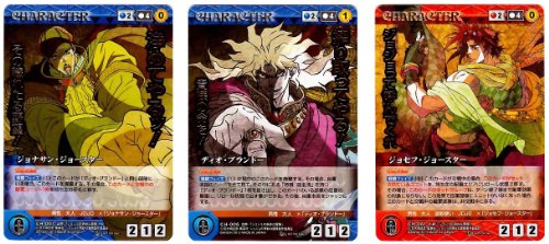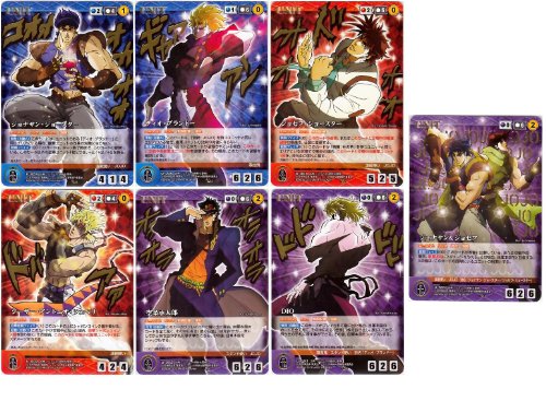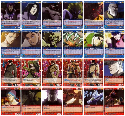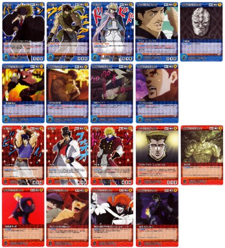 クルセイド ジョジョの奇妙な冒険JOC-01B 64種セットです。 内訳・・・コモン:全24種、アンコモン:全18種、レアカード:全12種、メタルレア全6種、ビザールレア全1種、BOX封入特典プロモカード全3種。カードの他に、ブースターの空き袋&ブースターの空き箱が付属(袋と箱の中には、カードは入っていません)。※収録カード…ジョナサン・ジョースター、ディオ・ブランドー、ウィル・A・ツェペリ、ジョセフ・ジョースター、シーザー・アントニオ・ツェペリ、リサリサ、カーズ、ワムウ、空条承太郎、DIO他