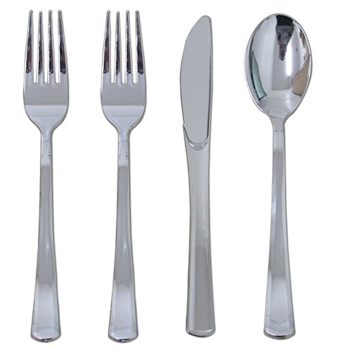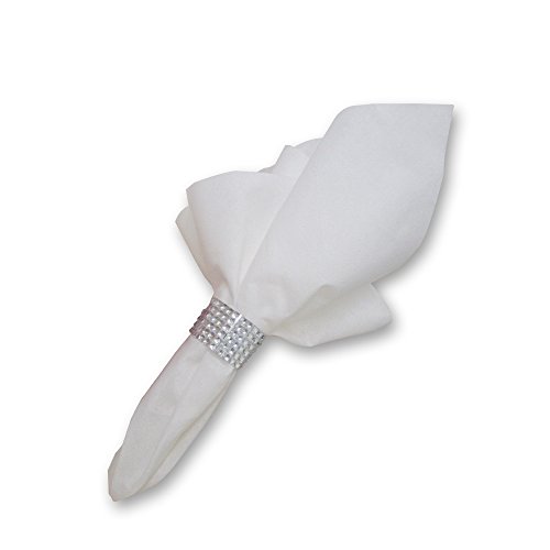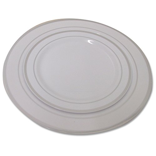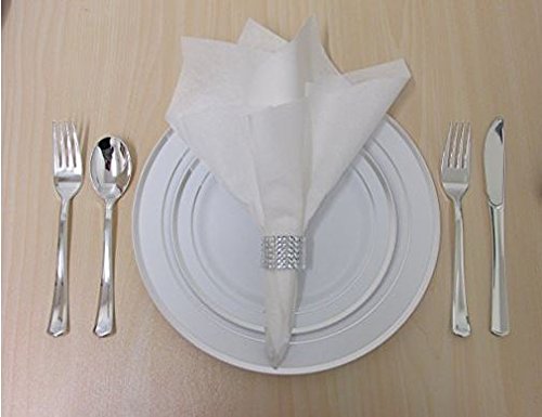 PACK INCLUDES: 40 10.25" white dinner plates with silver rim, 40 7.5" white dessert plates with silver rim, 40 silver rimmed tumbler cups, 80 silver forks, 40 silver spoons, 40 silver knives, 40 linen feel napkins which measure 18 x 16 inches when unfolded with 40 silver rhinestone napkin rings.