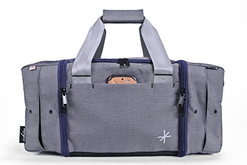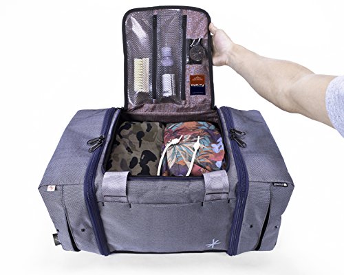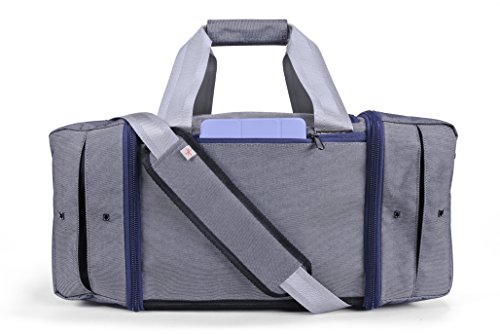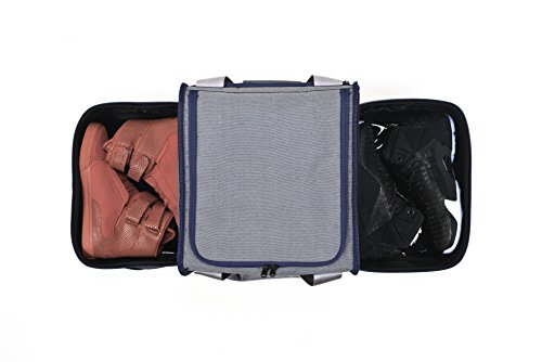 -. Feature : Fits two pairs of high-top or low-top sneakers (up to size 18), fits tablets and ipads / Fits one watches, fits a weekend's worth of clothes and toiletry bag [roughly two outfits] / Convenient side carry handles, rear zippered pocket fits tablets, quick-access front velcro pocket for phone or passport, complies with most international airline carry-on size requirements / Large side sections store two pairs of high top [or low top] sneakers, sneaker section has expansion panels to fit up to size 18 sneakers and ventilation grommets, one specialized pocket stores a watch / 22x12x10