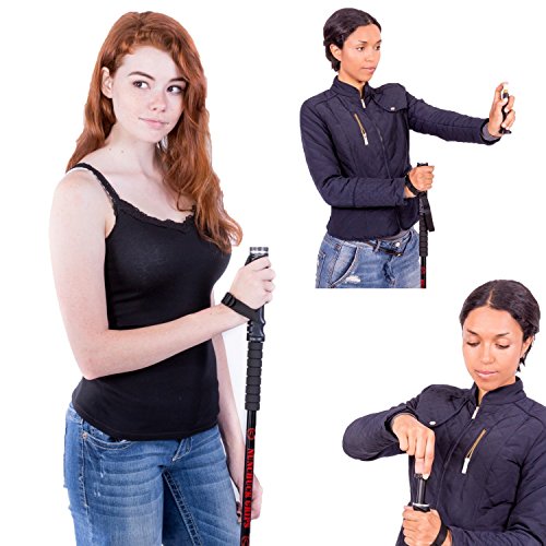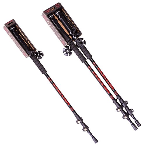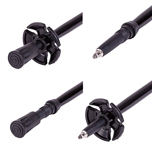 External tripod style clamps used to adjust the length from 31" to 59" accommodating hikers of all heights. Aerospace grade aluminum is strong and light. They come with a carbide tip for dirt, rubber tip for rocky terrain, and mud skirt for muddy/snowy conditions