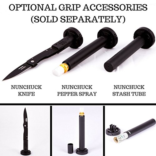 Nunchuck Pepper Spray Accessory is included in this Configuration. Potent 18% OC lab certified pepper spray is manufactured in the U.S.A. and can fire up to 12ft and up to 11 half second blasts firing a stream pattern to reduce wind blowback