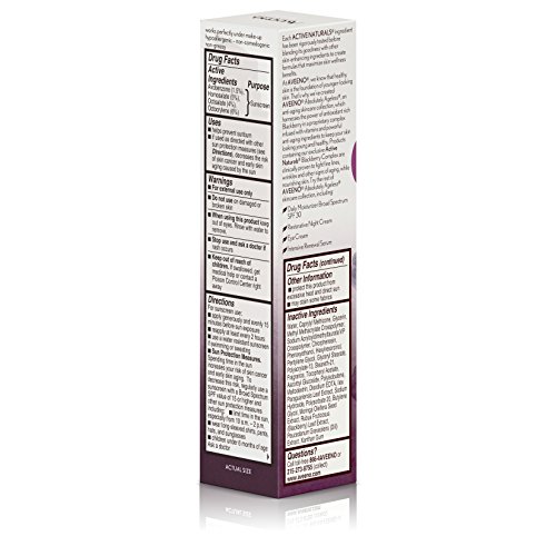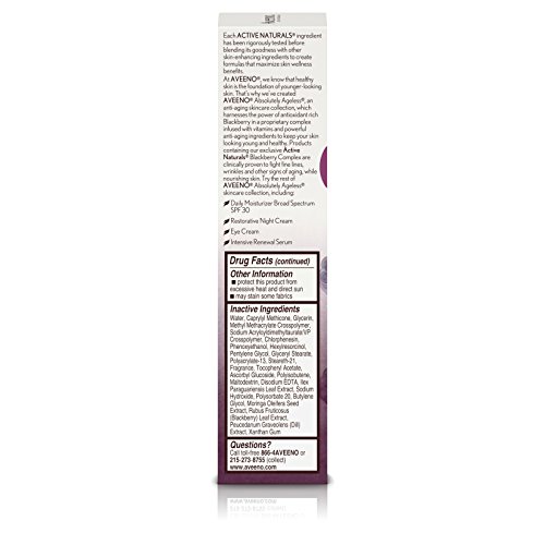 -. Binding : Health and Beauty -. Brand : Aveeno -. EAN : 0381371172856 -. Feature : 1.3-fluid ounce bottle of anti-aging leave-on day mask face lotion that keeps skin looking youthful and healthy for longer / Anti-aging facial moisturizer helps decrease the risk of early skin aging by visibly reducing the look of fine lines and wrinkles in just 1 week / Contains supercharged pollution-fighting antioxidants and provides broad spectrum SPF 30 UVA and UVB protection to fight against aging caused by the sun / Contains Active Naturals Blackberry Complex, a proP.R.Ietary complex infused with vitamins and anti-aging ingredients for younger looking skin / Super-lightweight and non-greasy formula is hypoallergenic and non-comedogenic to work perfectly under makeup -. IsAdultProduct : 0 -. Label : Johnson & Johnson Consumer Inc. -. Manufacturer : Johnson & Johnson Consumer Inc. -. MPN : ZC0104691 -. NumberOfItems : 1 -. PackageQuantity : 1 -. PartNumber : ZC0104691 -. ProductGroup : Beauty -. ProductTypeName : BEAUTY -. Publisher : Johnson & Johnson Consumer Inc. -. ReleaseDate : 2017-09-10 -. Studio : Johnson & Johnson Consumer Inc. -. Title : Aveeno Absolutely Ageless Leave-on Day Mask Face Lotion with SPF 30, Anti-Aging Skin Care, 1.3 fl. oz -. UPC : 381371172856