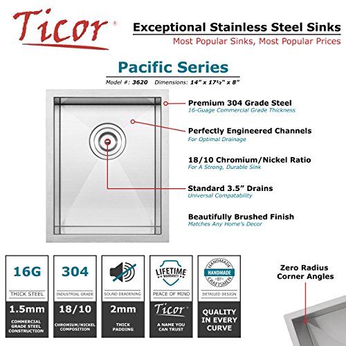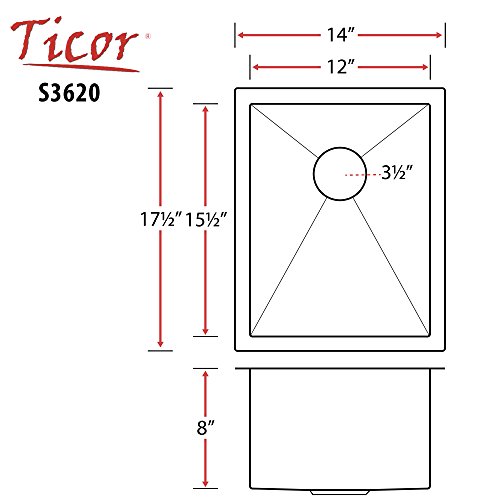 14" Ticor S3620 Pacific Series 16-Gauge Undermount Stainless Steel Single Bowl Zero Radius Square Kitchen Bar Sink