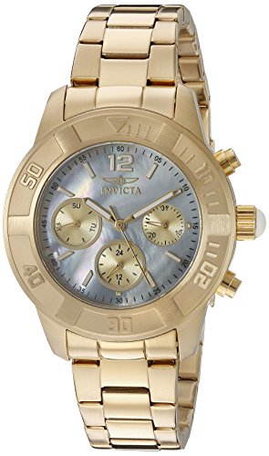 -. Binding : Watch -. Brand : Invicta -. Color : mother-of-pearl -. Department : womens -. EAN : 0886678264759 -. Feature : 24 Hour, Day of The Week and Date Rose Gold Tone Sub dials; Crown with White Cabochon; Flame Fusion Crystal / Platinum Mother of Pearl Dial with Gold Tone and White Hands, Hour Markers and Arabic Numeral at 12:00; Luminous; 18k Gold Ion-Plated Stainless Steel Case and Bracelet / Swiss-quartz Movement / Case Diameter: 38mm / Water Resistant To 330 Feet -. Label : Invicta -. Manufacturer : Invicta -. Model : 21612 -. MPN : 21612 -. PackageQuantity : 1 -. PartNumber : 21612 -. ProductGroup : Watch -. ProductTypeName : WATCH -. Publisher : Invicta -. Studio : Invicta -. Title : Invicta Women's 21612 Angel Analog Display Swiss Quartz Gold Watch -. UPC : 886678264759