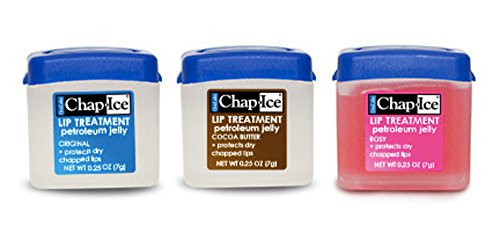 The petroleum-based formula of the Chap•Ice Petroleum Jelly Mini Jar Assortment provides welcome relief from lip dryness and chapping. In assorted flavors: original (unflavored), cocoa butter, and rosy. 45 individually wrapped 0.25 oz. mini jars per plastic fishbowl canister.Feature