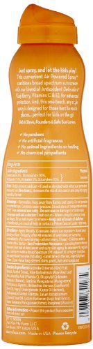 -. Feature : Ingredients: [active] avobenzone, homosalate, octinoxate, octisalate, octocrylene, [inactive] kiwi fruit extract, denatured alcohol, aloe vera leaf juice, vitamin C, dicapylyl carbonate, natural fragrance, mangosteen fruit extract, glycerin, sunflower seed oil, castor oil, hydrogenated methyl abietate, linseed seed oil, goji fruit extract, pomegranate extract, vitamin E / Volume: 6 fl oz / Duration: 40 minute water-resistance / SPF: 50 / Spray-On: yes, Air Powered Spray