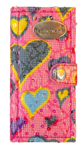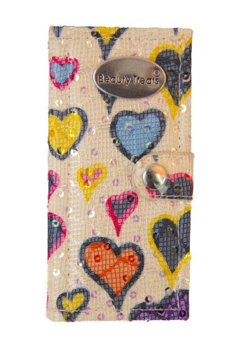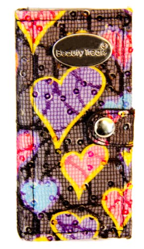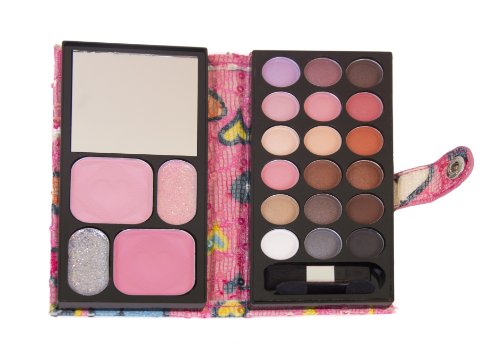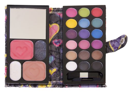-. Feature : Purse MakeUp Kit With Snap to hold securely Closed / Cover is a Lace Texture with Sequins and Heart Print / 18 Eye Shadow colors / Blush, Bronzer, Glitter and Mirror / Applicator included