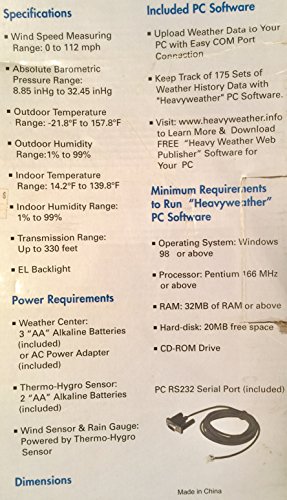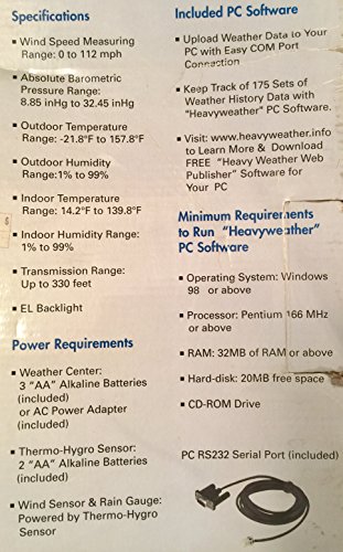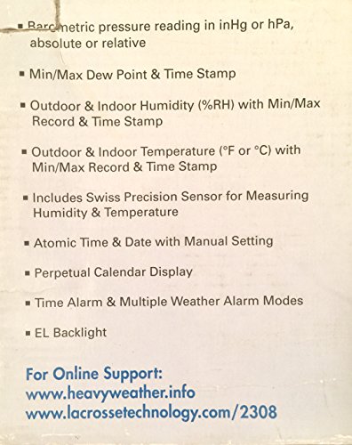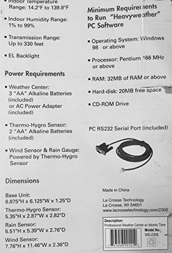 -. Binding : Kitchen -. Brand : La Crosse Technology -. Color : Aluminum -. EAN : 0757456991412 -. Feature : Wind speed, wind direction, wind chill and dew point display / Rainfall for the past 1 hr, 24 hrs and total / Forecast icon with weather tendency indicator / Indoor and outdoor temperature and humidity display / Included (optional) PC interface -. IsAutographed : 0 -. Label : La Crosse Technology -. Manufacturer : La Crosse Technology -. Model : WS-2308AL -. Platform : Windows -. ProductGroup : Home -. ProductTypeName : HOME -. Publisher : La Crosse Technology -. ReleaseDate : 2005-07-08 -. Studio : La Crosse Technology -. Title : La Crosse Technology WS-2308AL Professional Weather Station, Aluminum -. UPC : 757456993317 -. Warranty : 1 year warranty