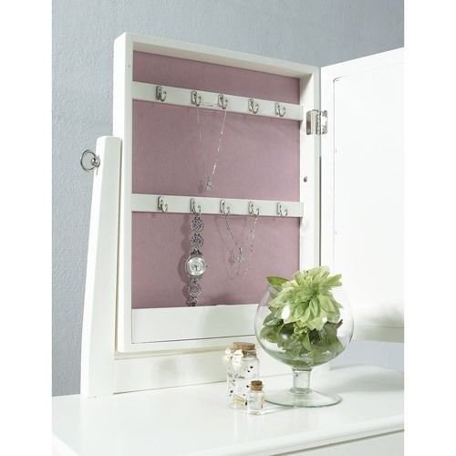 -. Brand : Youth Vanity -. Color : Pink -. EAN : 0181438244690 -. Feature : White finish Wood construction Includes vanity, mirror and bench Swivel mirror features hidden jewelry storage / Vanity drawer features ring rolls and additional storage space for jewelry and beauty supplies Bench features pink microfiber upholstery Vanity dimensions: 26"W x 12.5"D x 47"H / Drawer dimensions: 19.5"W x 9.375"D x 3"H Bench dimensions: 16"W x 12"D x 14"H Model# 270-510T2 -. PackageQuantity : 1 -. ProductGroup : Furniture -. ProductTypeName : HOME_FURNITURE_AND_DECOR -. Title : Youth Vanity, Bench and Mirror Set with Jewelry Storage, White -. UPC : 181438244690