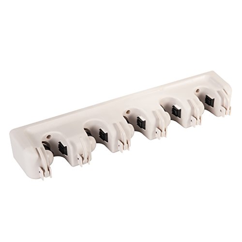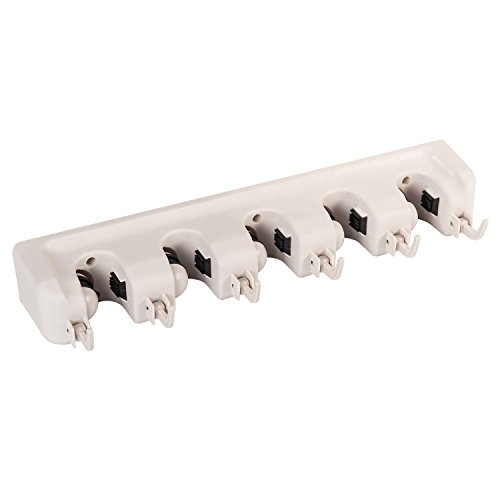 - The mop holder is composed of 5 rolling ball slots, 6 movable hooks and a strong rack. It has features of saving space and organize mops