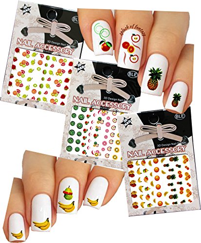 -. Binding : Misc. -. Brand : La Demoiselle -. EAN : 0616241327129 -. Feature : 3 sheets of adorable 3D designs as pictured / Turns each nail into beautiful and unique masterpiece / For application refer to instructions on the back of the package or below. / Quick and easy application. Fun wear. -. IsAdultProduct : 0 -. MPN : Zoyya_234 -. PackageQuantity : 1 -. PartNumber : Zoyya_234 -. ProductGroup : Beauty -. ProductTypeName : BEAUTY -. Title : Fruit Nail Art 3D Stickers Decals, Set of 3 -. UPC : 616241327129
