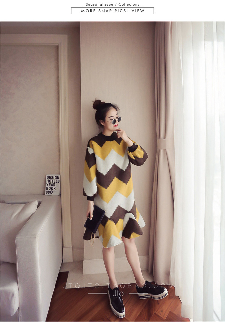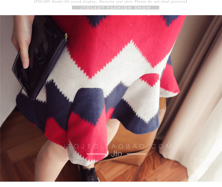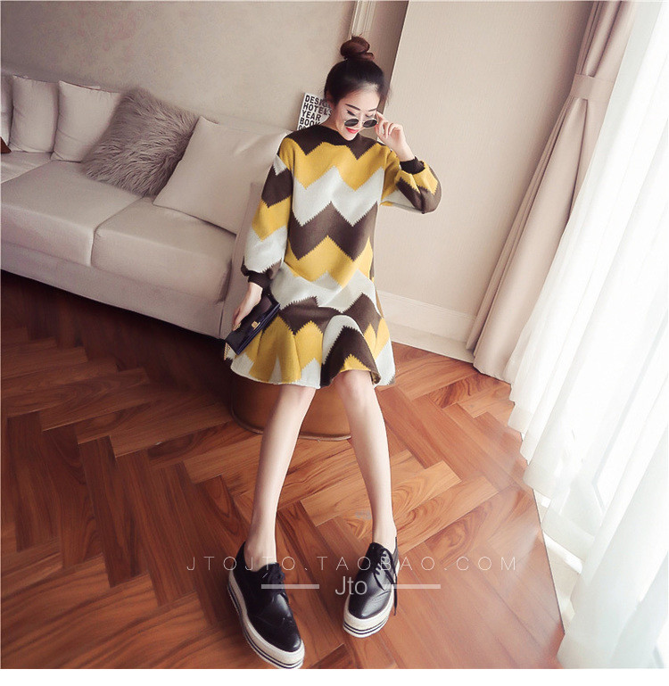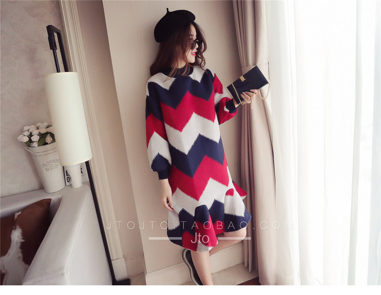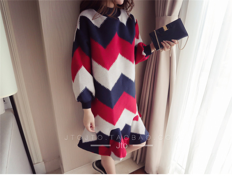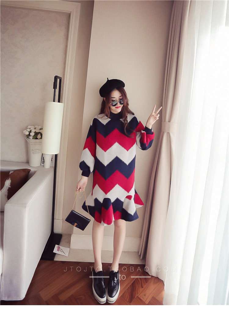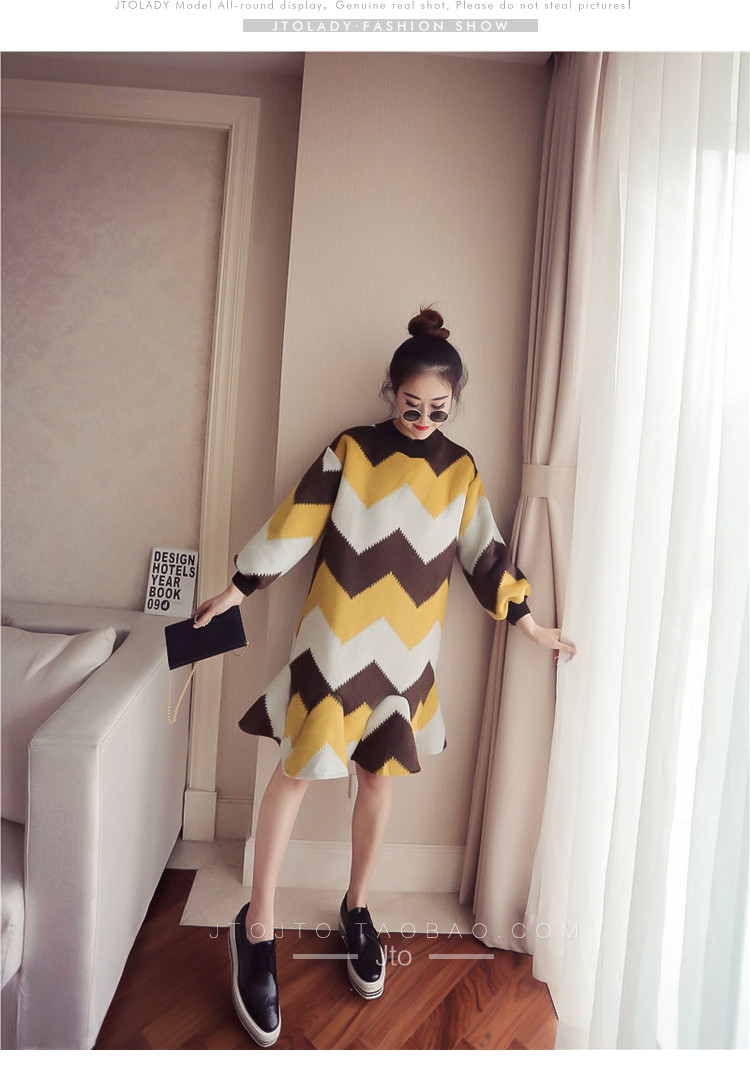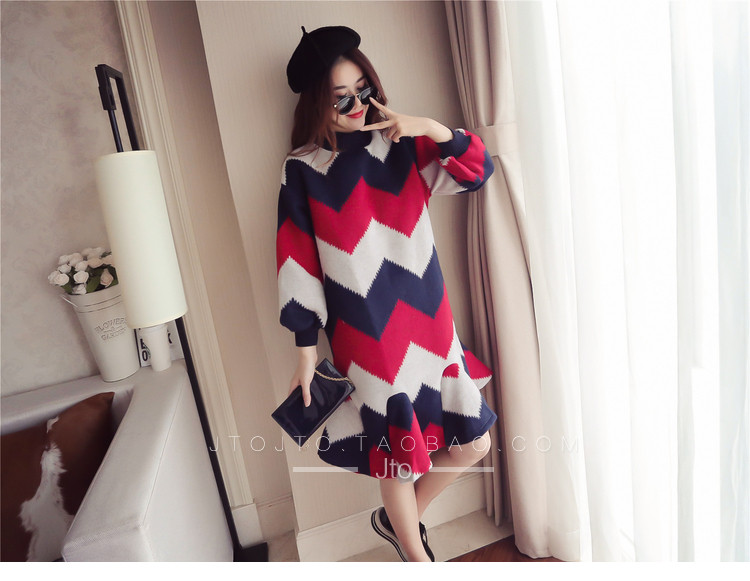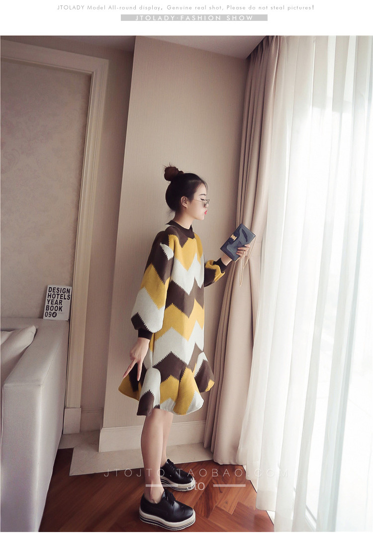 | Name. | 品名 - | 条纹A字毛呢连衣裙女秋冬新款宽松灯笼袖荷叶边套头鱼尾裙潮V273 |