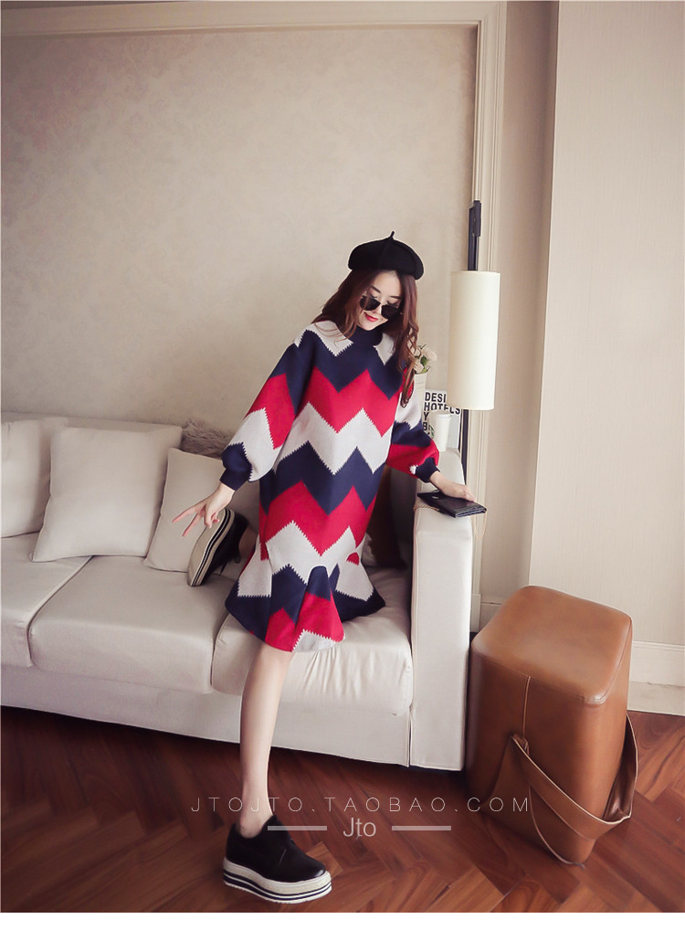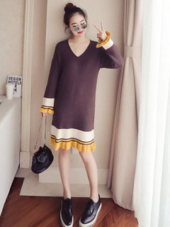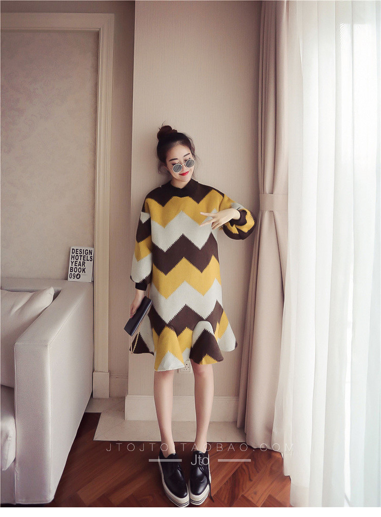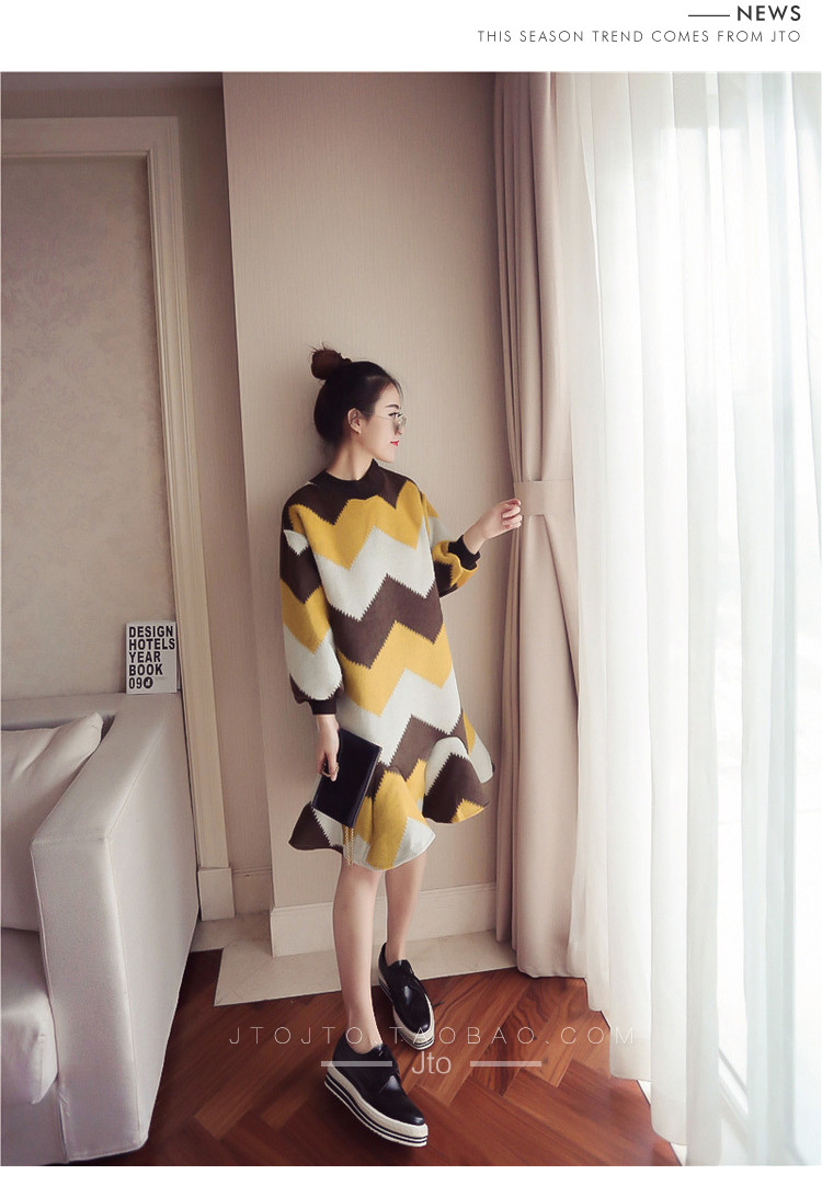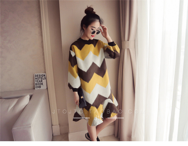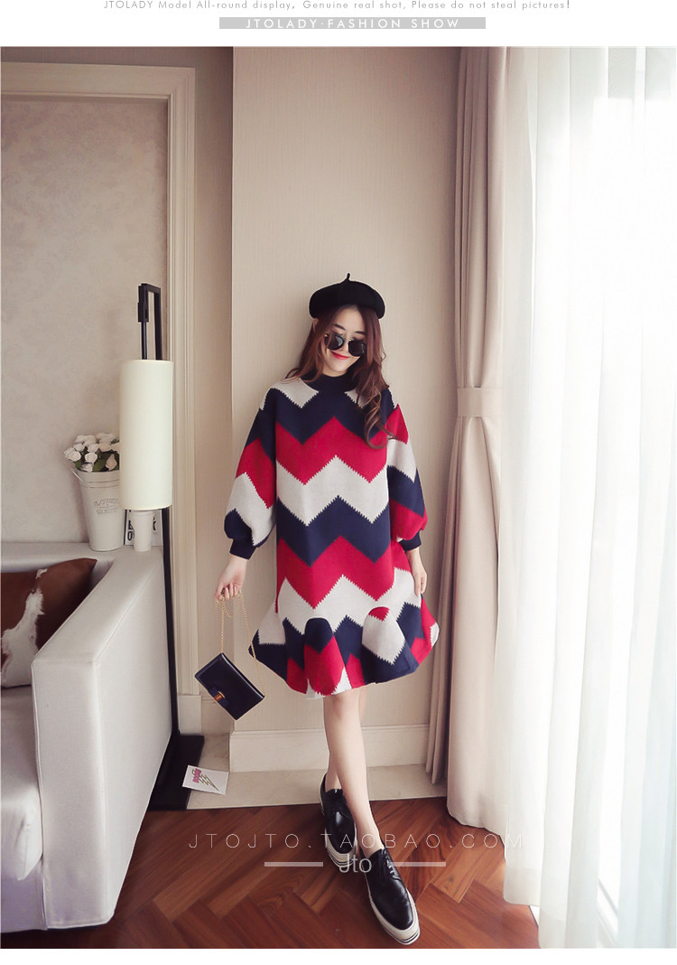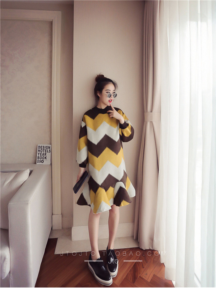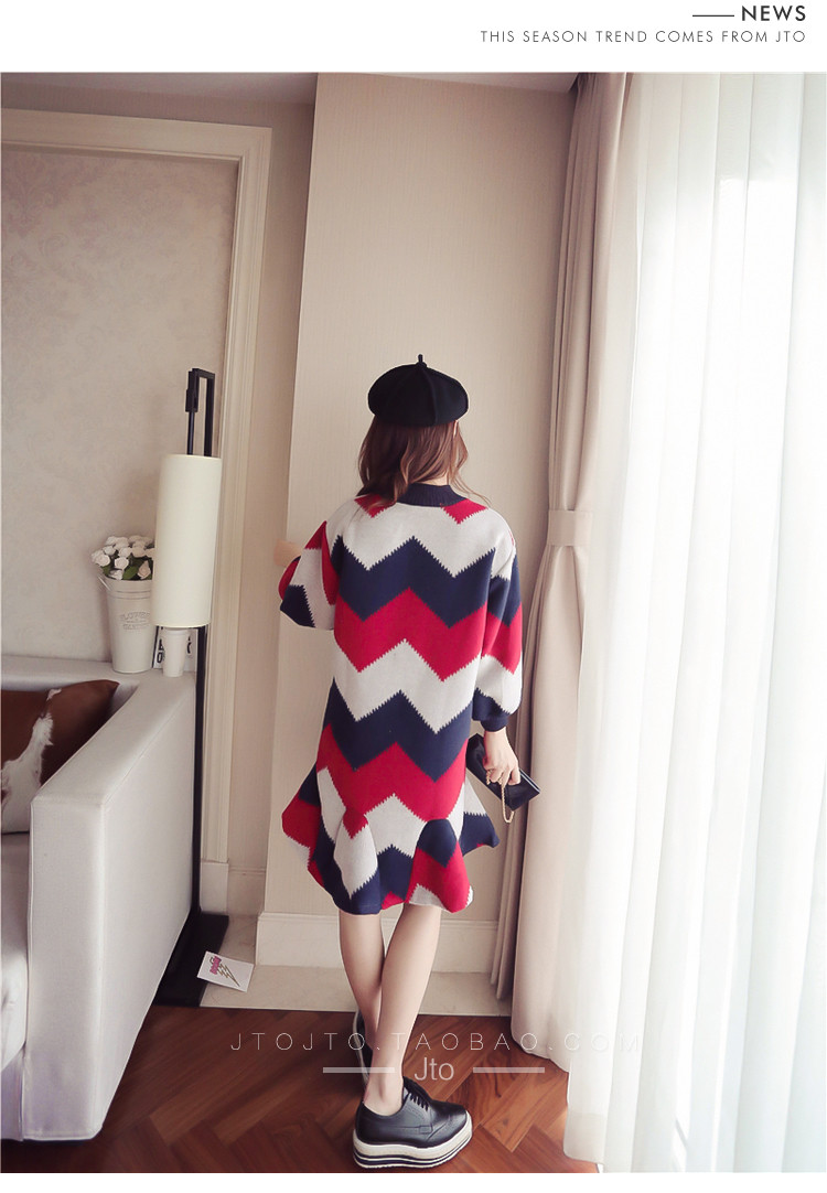 | Name. | 品名 - | 条纹A字毛呢连衣裙女秋冬新款宽松灯笼袖荷叶边套头鱼尾裙潮V273 |