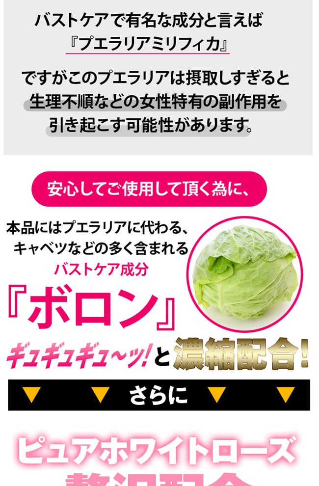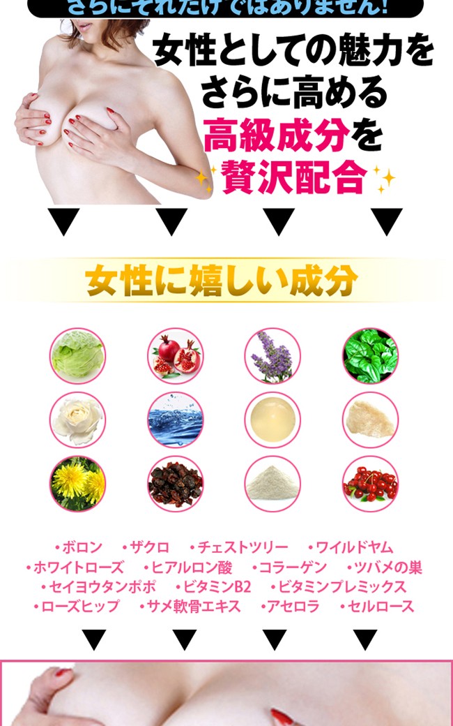 ホウ素(ボロン)含有酵母、ブラックコホシュエキス末、アグアヘエキス末、チェーストツリーエキス、マカパウダー、豚プラセンタエキス末、大豆胚芽抽出物、ワイルドヤムエキス末、デキストリン、ザクロ果汁/セルロース、ステアリン酸カルシウム、微粒酸化ケイ素 |