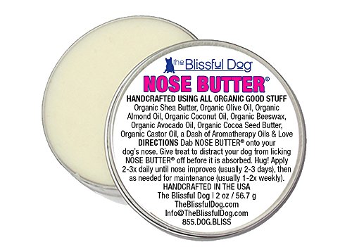 Many dogs have a tendency toward a dry, crusty nose condition, frequently called nasal hyperkeratosis. While any dog can have this condition some breeds have even more of a predisposition toward dry noses; French Bulldogs, Boxers, Pugs, Bulldogs, most Bully type and Mastiff breeds and their mixes. NOSE BUTTER was developed specifically for this condition. NOSE BUTTER For Dry or Crusty Dog Noses. All natural, rich moisturizers soften and smooth your dog's dry, crusty, cracked nose. NOSE BUTTER is individually handcrafted in far northern Minnesota (yes, it is science fiction cold in the winter) using all natural and organic good stuff: shea butter, olive oil, castor oil, avocado oil, almond oil, coconut oil, beeswax, cocoa seed butter, a dash of essential oils and love. NOSE BUTTER USAGE: DAB a bit onto your dog's nose 1-3x a day for 2-3 days (until nose improves) and then as needed for maintenance (usually1-2x a week). DISTRACT with a treat (keeps them from licking NOSE BUTTER off while it moisturizes).DONE! Complete directions, tips, hints and Dog Nose info is available.Feature