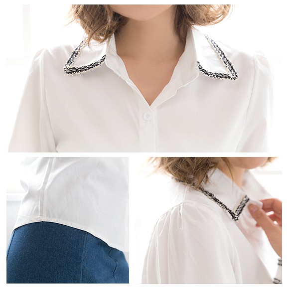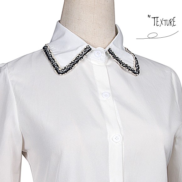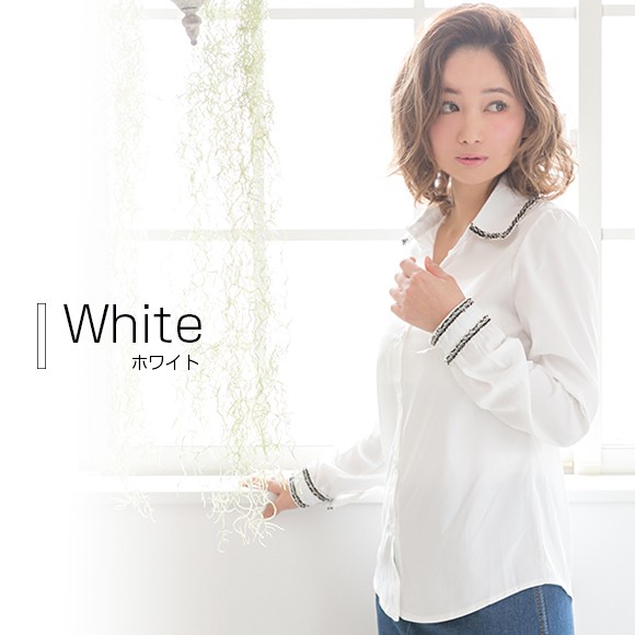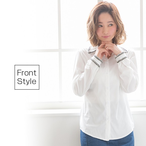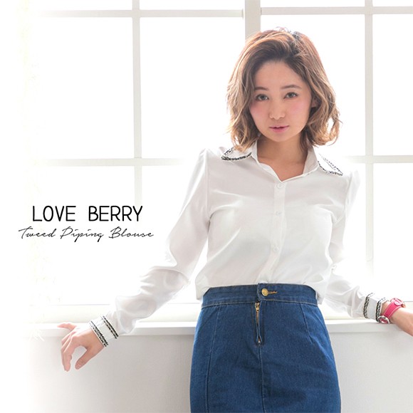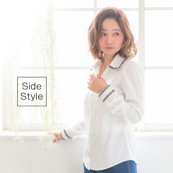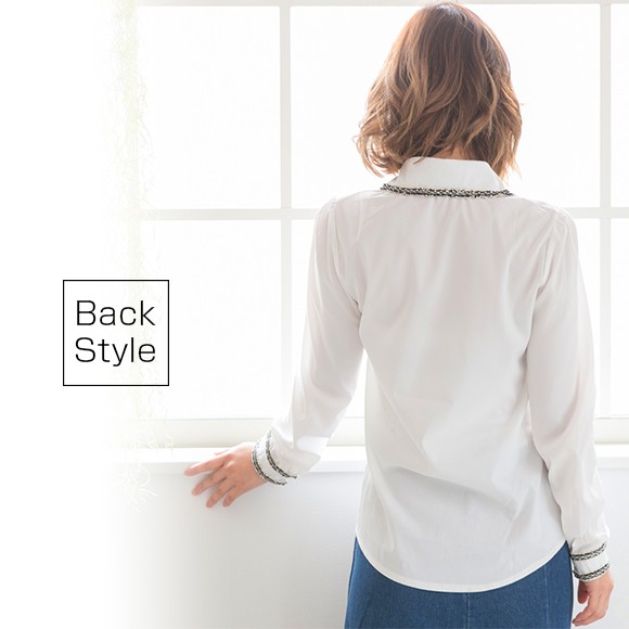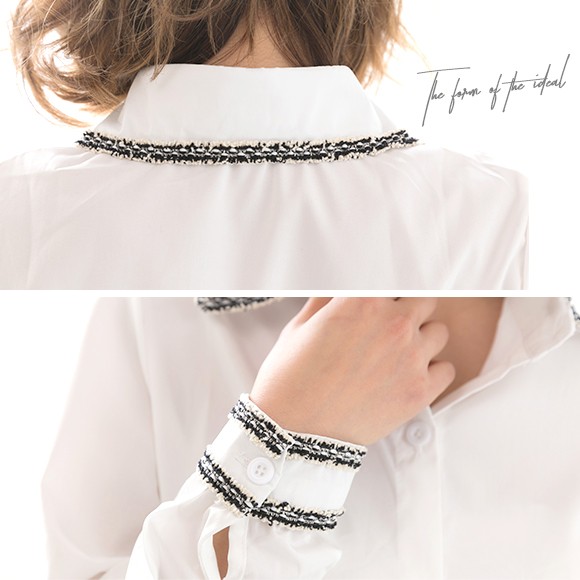 ツイードのパイピングがおしゃれなブラウスです。