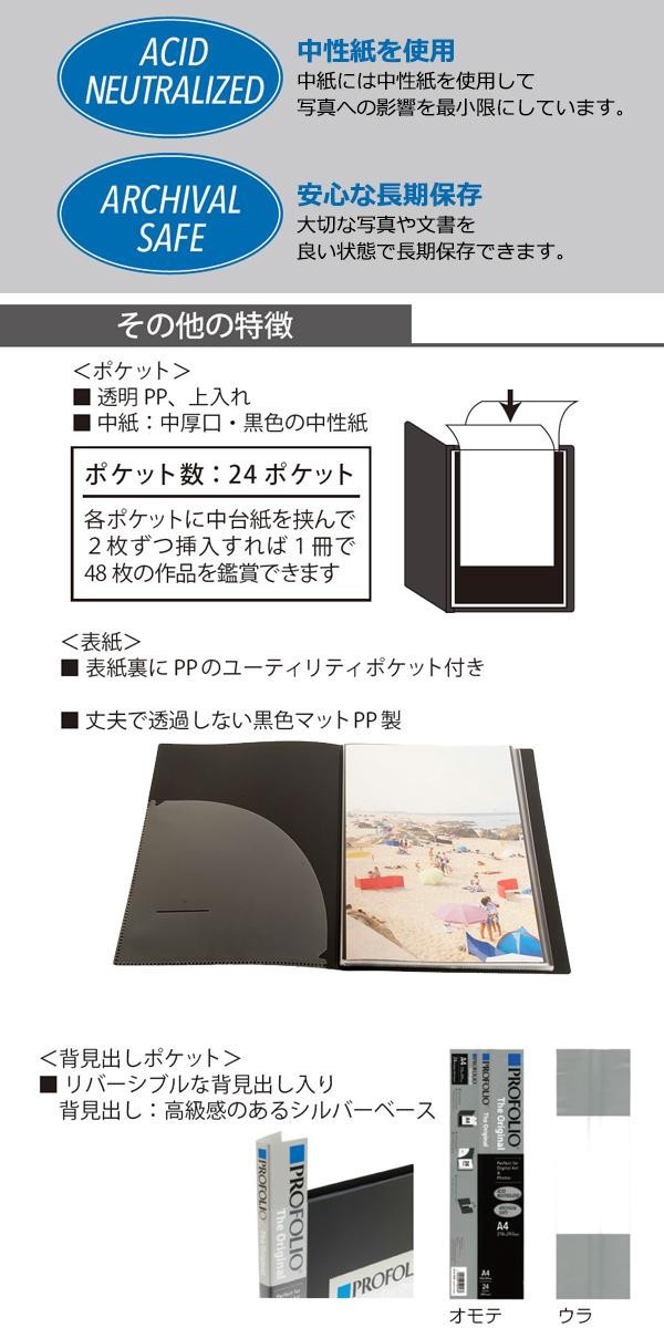 | 仕様 | ■背見出しポケットあり ■ポケット:24ポケット・中紙あり(黒色中性紙) ■収納推奨サイズ:A4・210×297mm ■溶着式製本 ■ユーティリティポケット付 |