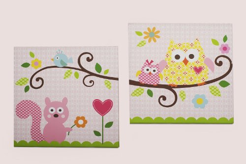 Decorate your baby's nursery with the Kidsine Happi Tree set of two canvas wall arts, featuring adorable squirrel and owls decorated with blooming flowers in colors of pink, green, blue, and yellow.