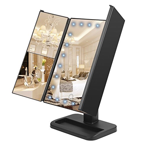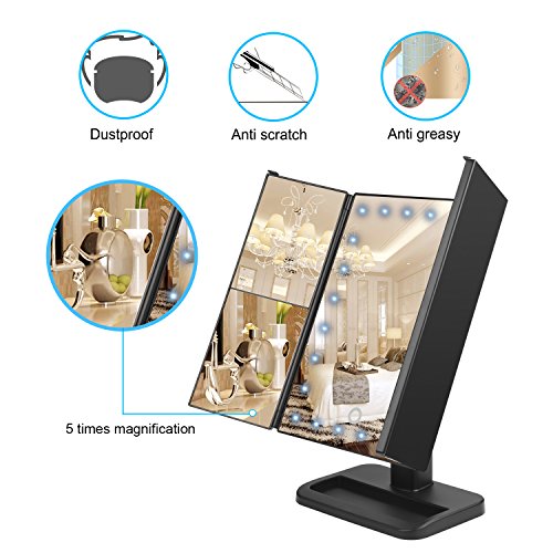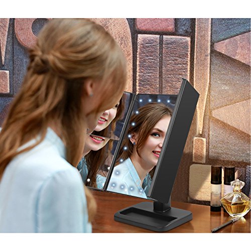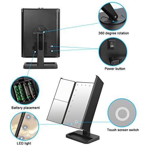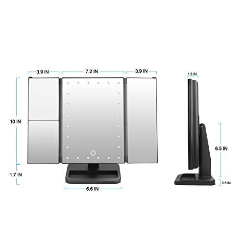 The front has four (3) different mirrors.One on the side, in the middle and then the one on the other side which consists of three section 3x,1x and a 2x mirror magnifier,it will help to get a better look to anything on your face you want to focus on.The middle mirror has 24 LED light which brightness can be adjusted by pressing the touch sensor switch found at the bottom part of the same.