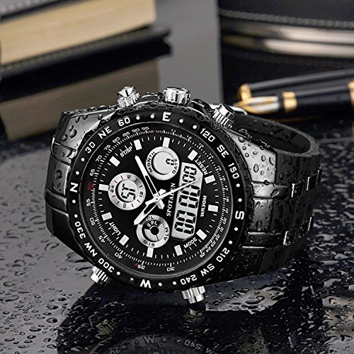 -. Feature : Sports Watch for Men: Perfect for both indoor and outdoor activities. Silicon rubber watch band with the large dual dial design make it comfortable to wear and lead you to edge sport fashion. / Digital Analog Watch with LED Backlight: analog and digital dual display. Press LED backlight button to read time clearly in low light. / Multi-functional Watch: Dual display 12H/24H, Calendar Day and Date, Alarm, Water Resistant, LED Display, Back Light, Water Resistant, Stop Watch. / Water Resistant: can not go deep water, just for daily use, like splash proof, not for swimming or diving. / WHAT IS IN THE PACKAGE: 1*Dual Dial Sports Watch for Men, 1*Box with exquisite packaging.