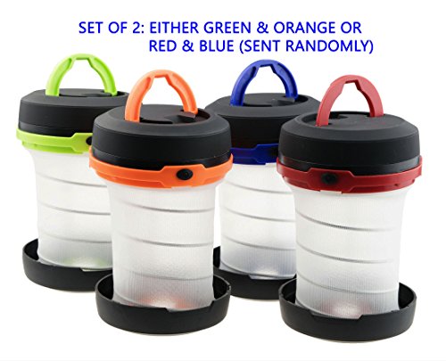 2 piece set of powerful super bright LED camping lanterns. Comes in colors: Either green & orange or red & blue (sent randomly) Perfect to share with families and friends for camping, hiking and other outdoor activities.