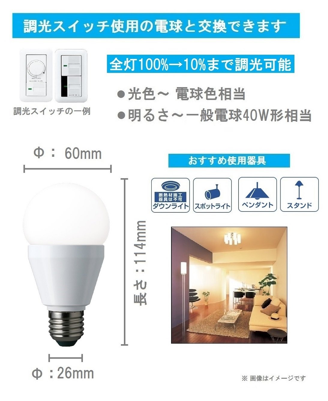 Rated power consumption: 7.1 W Rated life: 40000 hours Dimensions (approx.): OD 60 x Total Length 114 mm Weight: 104 g / * Dimmer with Human Sensor / Stepwise dimmer / Remote control type dimmer