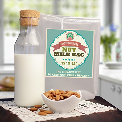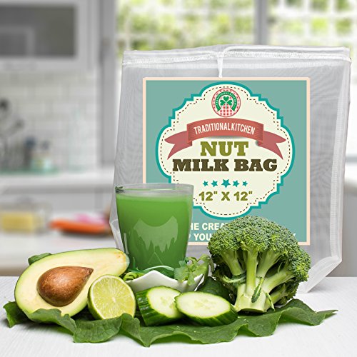 - The TRADITIONAL KITCHEN perfect quality and size 12"X12" NUT MILK BAG! This REUSABLE nut milk bag is a MULTI-FUNCTION Kitchen Tool with dozens of uses, including cold brew coffee filter, homemade juicer, homemade yogurt maker, general use strainer and much, much more. It has more surface area for Faster Squeezing, so it WON’T STRETCH or TEAR!