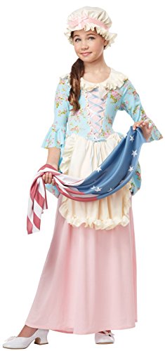 The Colonial Lady child costume is great for dressing up as historical figures like Betsy Ross and Martha Washington. Costume includes dress with attached apron, cap, and a US 13 states star flag. Shoes not included.Feature