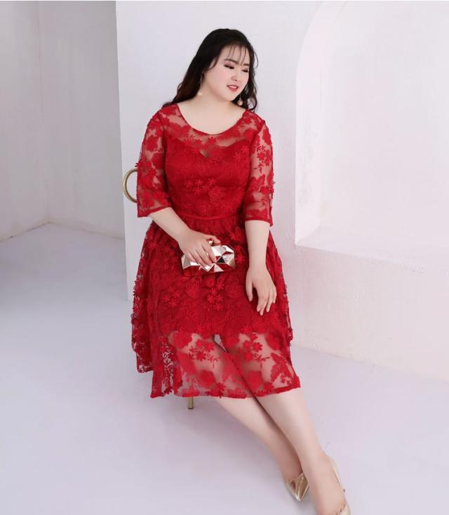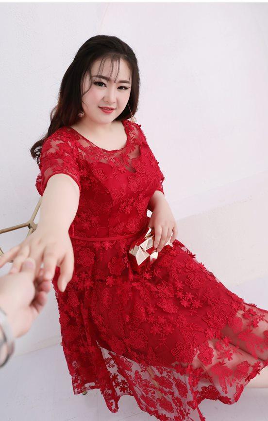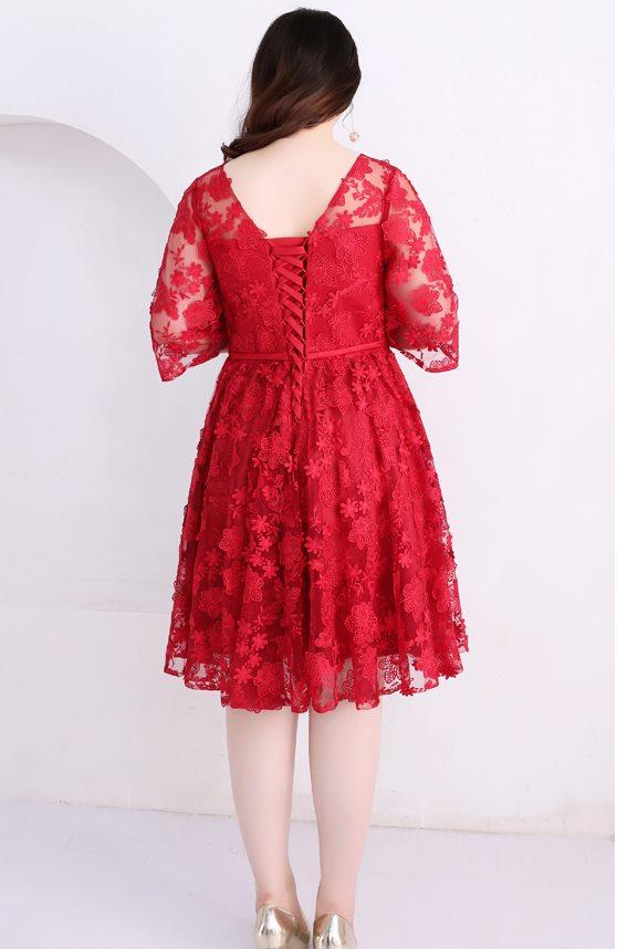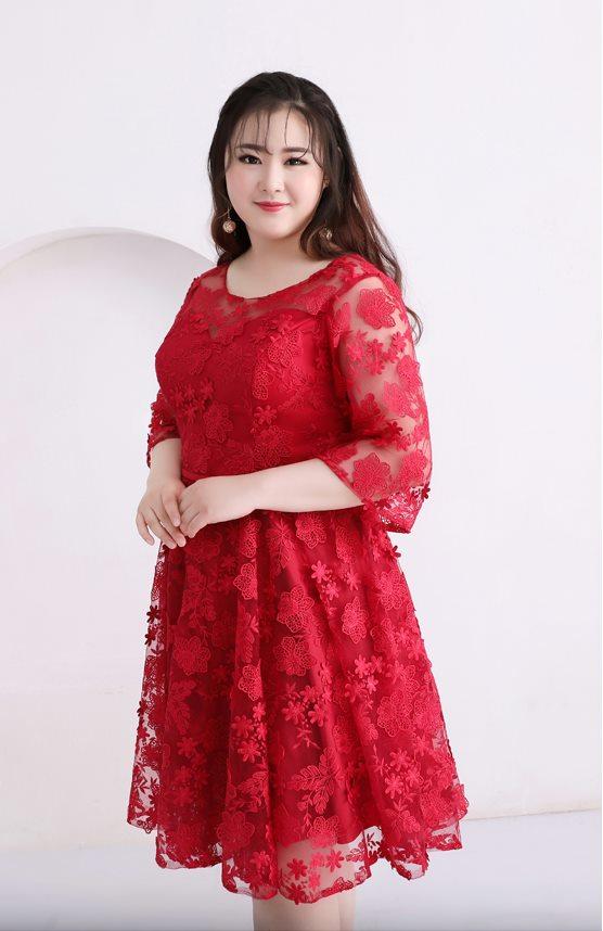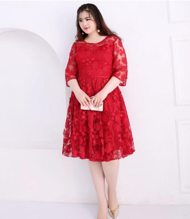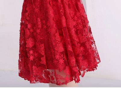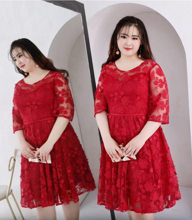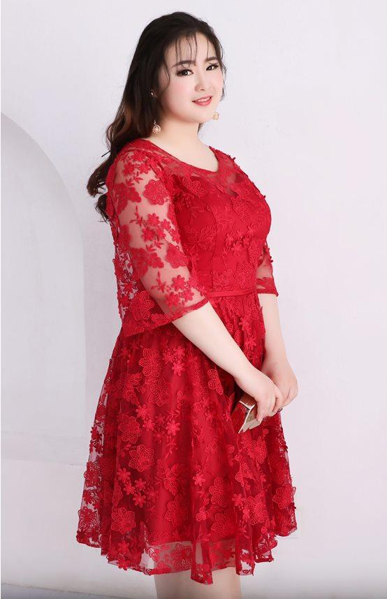 大小の花模様刺繍を施したレースのフィットアンドフレアのパーティードレス