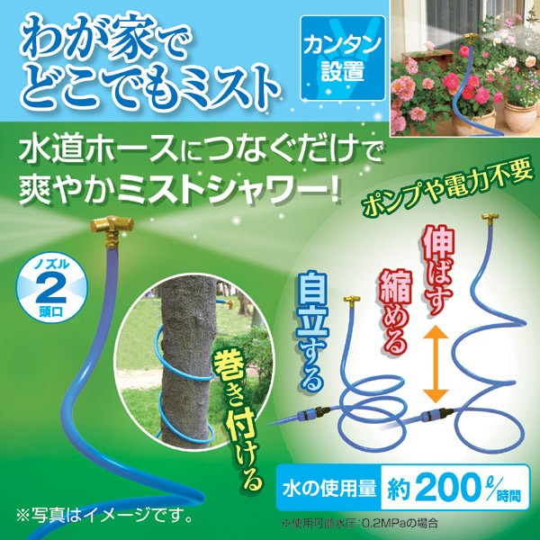 ●木の枝や柱に巻きつけて使用可能で、高い場所から霧のシャワーカーテン!