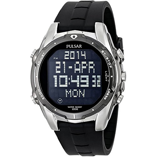 Stainless steel case; black dial; digital calendar function; chronograph functions
