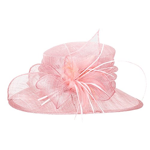 Product Description? Color : Peach ? Theme : Feather, Flower Leaf ? Crown Circumference : 23" ? Crown Height : 4.5" ? Brim Width : 4.5" ? Material : 100% Sinamay ? Feather Leaf Centered Medium Side Brim Sinamay Hat0