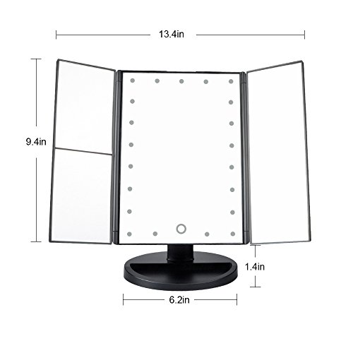 Vanity Mirror, McDou Touch Screen Lighted Makeup Mirror with 3x/2x Magnification,Trifold Mirror with 21 Led Lights, 180° Adjustable Rotation, Dual Power Supply, Countertop Cosmetic Mirror (Black)