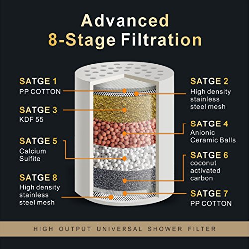REINFORCED COMPOSITE FILTER - Besides PP Cotton and High Density Stainless Steel Mesh on both sides, our advanced filtration system consists of: Active Carbon + High-purity KDF 55 + Anionic Ceramic Balls + Calcium Sulfite. 8-Stage Filter guarantee,effective for low and high water temperature.