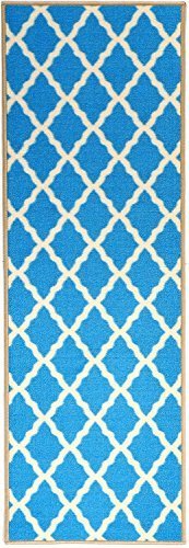 Studio : Ottomanson Publisher : Ottomanson Binding : Kitchen Product Description Ottomanson Glamour Collection is the perfect combination of fashion and functionality. Boost up your spirit instantly and effortlessly when you roll out this stylish rug featuring an aesthetic lattice design with conspicuous cream-colored Moroccan Trellis motif on the vibrantly-hued base in blue composing a blend of traditional and fashionable flair. As an eye-catching piece, this high-quality yet budget-friendly rug will also create a focal point with simple yet classy geometric design in a charming ogee pattern. Stain and fade ressistant low-profile surface pile and hemmed edges offer a clean and tidy look, an easy upkeep and comfortable footing without bulks under your feet and under doors. This glamorous rug takes on the dual job of being visually appealing and combating kids, pets and high traffic areas to preserve your floors in the kitchen, by the kitchen sink, stove area, bathroom, living room, dining room, playroom, hallway, entryway, staircase, foyer, pets' feedinglitter area, kids room or any other room in your house or office. Its non-skid rubber backing assists with firm grip as you stand on it during your daily activities. Constructed with durable materials and naturally stain resistant high-quality nylon pile, these rugs will remain serviceable for long without requiring your effort even in spill-prone areas: just rotate periodically, vacuum and spot clean with mild detergent if necessary. From transitional to modern, child to adult, this versatile rug will appeal to the eye with colorful visual intrigue and will make a great gift for holidays, birthdays and baby showers. 0