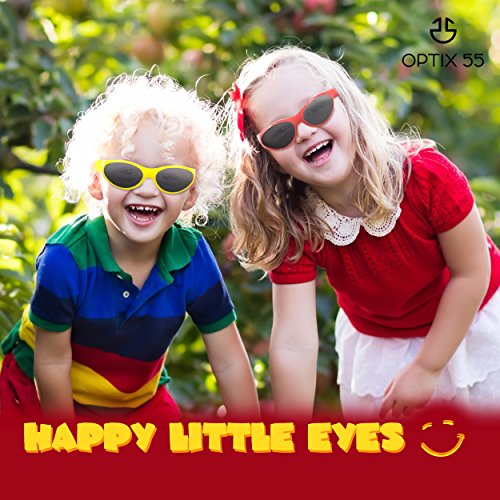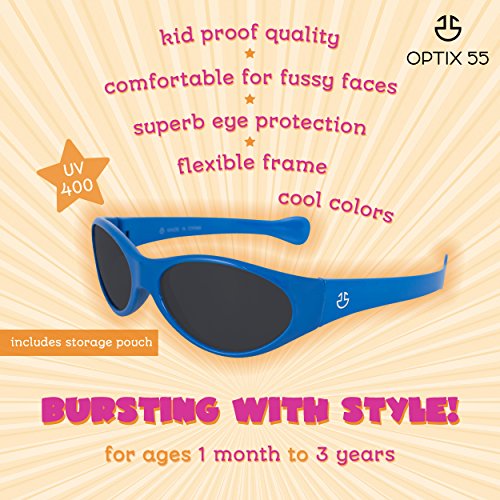Product Description PROTECT YOUR BABY'S PRECIOUS EYESIGHT At the beach or on the go, even when it's overcast, the sun's rays are always beating down on us. But those sunny rays that feel so great on our skin can be damaging, especially to your baby's sensitive eyes. Protect their eyes in style with these adorable sunglasses from Optix 55 which are designed specifically to fit babies and toddlers aged 1 month to 3 years. About This Product: ? 100% UV Protection ? Smoked Lenses ? Neutralizes Glare So Objects Appear Clearer Brighter ? Baby Sees Clearly To Avoid Accidents ? Assorted Colors ? Designed to Fit Babies Toddlers Ages 1 Month-3 Years ? Durable Design For Long-lasting Performance ? Perfect For High Impact Activities ? Matching Pouch Included STYLISH SMOKED SUNNIES FOR SAFER PLAYTIME Our smoked lenses provide UV Protection and reduce glare, so your child sees objects and the world around them more brightly and clearly, to avoid accidents and prevent eye strain. Your baby will enjoy hours in the sun with you while their delicate eyes are protected from harmful UV rays. You can have peace of mind knowing your baby is having fun in the sun safely and comfortably. SUPERIOR QUALITY SELECTION Optix 55 brings you the best in fashionable, functional infant eyewear with these sunglasses that will have your little one stepping out in style with full protection from damaging sun rays. These sunglasses are perfect for protecting your child's delicate eyes when out for a day at the beach, the pool and any other outdoor excursions. Because your babies eyes are particularly delicate they need protection from the sun even on days that aren't extremely sunny making this a worthwhile investment that you can use year round. With so many styles and colors to choose from, Optix 55's Sunglasses for Babies are the obvious choice to keep your baby's eyes protected with flair! 0